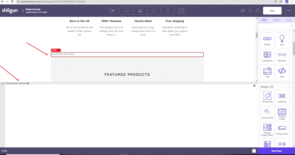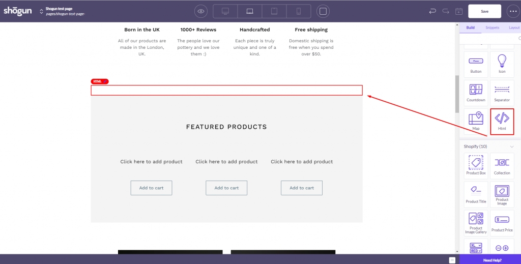 2. On right navigation bar > click Build tab, click HTML session and drag to the position you want on the page