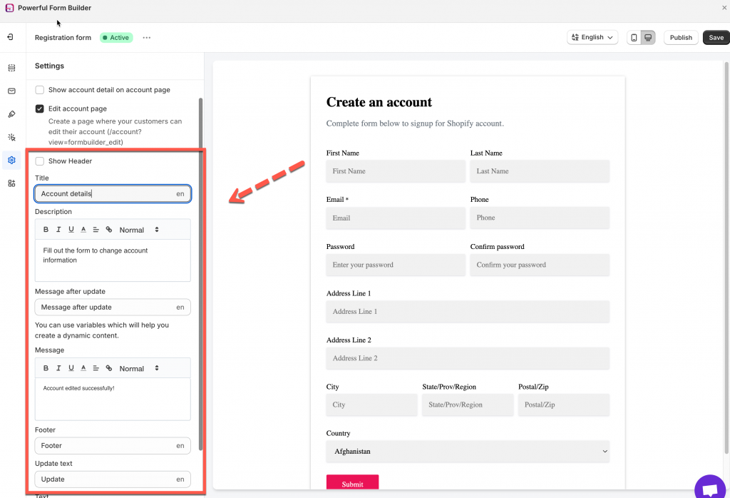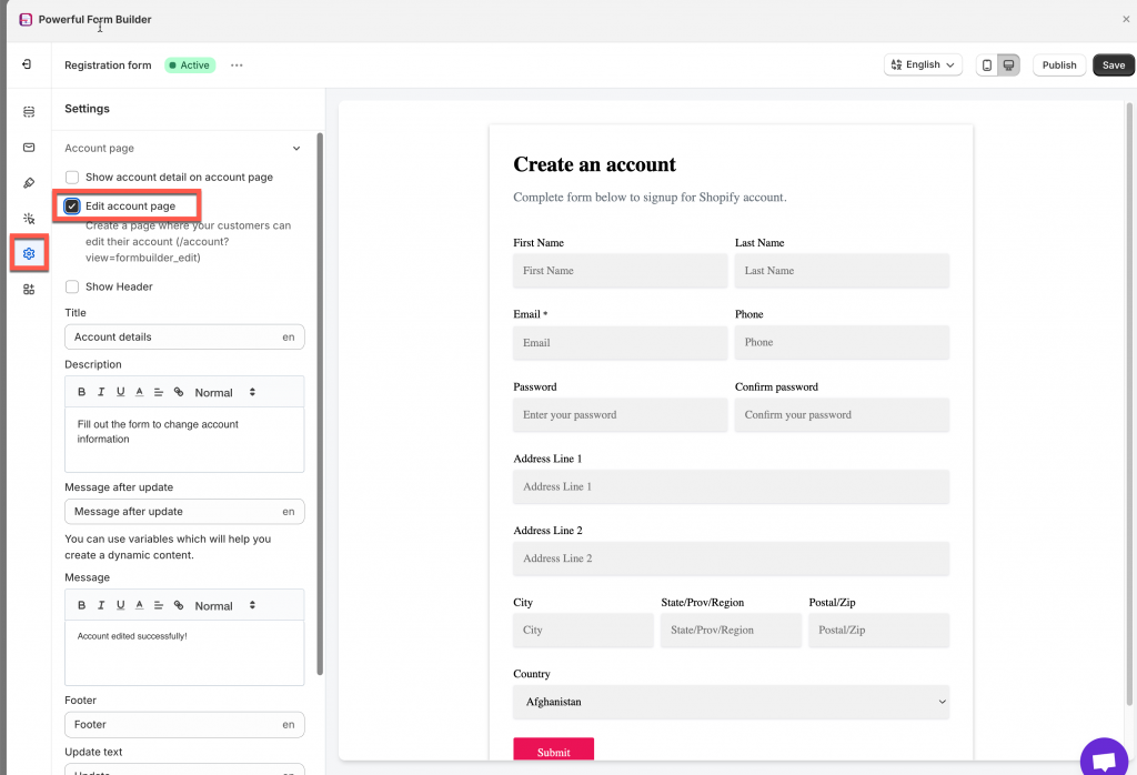 This create a page where your customers can edit their account (/account?view=formbuider_edit) (optional)