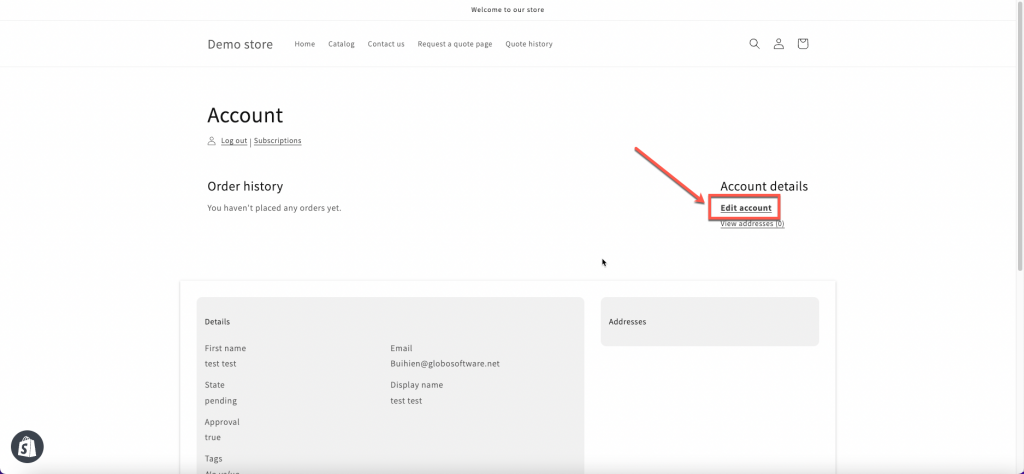 The email address cannot be changed via this account page — per Shopify requirements.