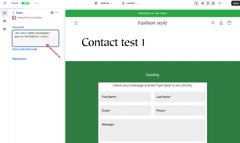 This guide shows you how to place a form created with Powerful Contact Form Builder directly into any page or template on your Shopify store using the App Block method.