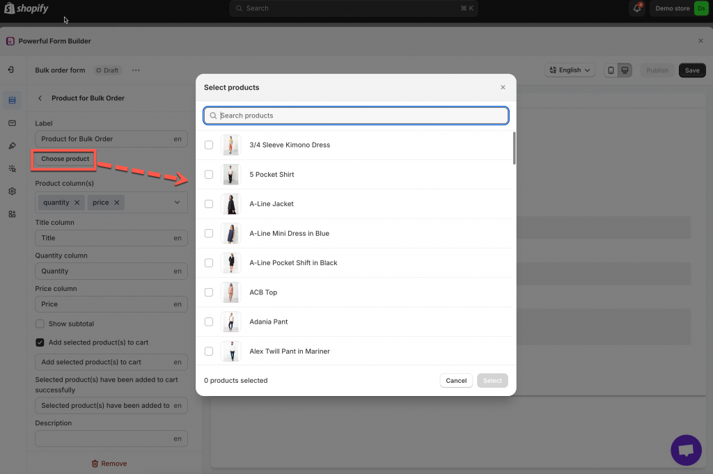 2. Click Choose product button > tick on the corresponding checkbox to select any products to showcase on this form. The list of selected items will appear under the Choose product button. You can delete or change the position of each product.